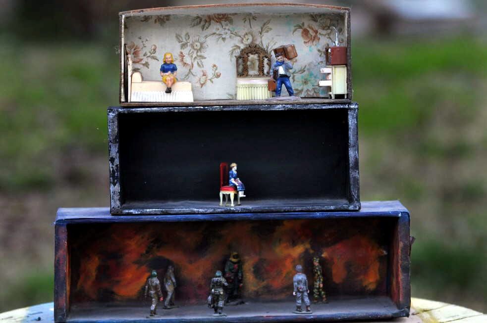 Las maquetas, las casas de muñecas, los caballitos y los gatitos, los juguetes de jardín, son rescatados de la caja guardada de los recuerdos como objetivos de estudio y de intervención que mientras se rescata la imagen del pasado, también la recicla de ideologías y conceptos.