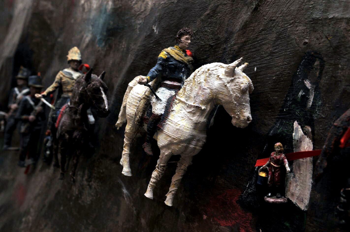 Un primer plano al muñeco del General San Martín y su caballo blanco (hecho con impresora 3D) de su cuadro “Paisaje”, que obtuvo mención del jurado en el concurso del Salón de Pintura Bicentenario de la Independencia Argentina de este año.