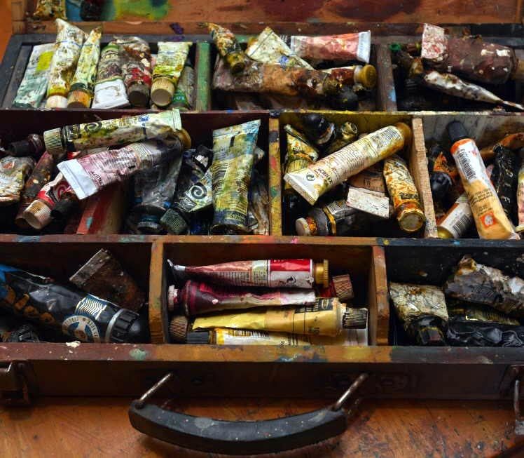 Técnicas. A Orlando le gusta incursionar en nuevas técnicas todo el tiempo, y no decanta en ninguna en especial (aunque reconoce que es conocido principalmente por la pintura). Su taller da cuenta de esas búsquedas (pinceles de todos los tamaños, pinturas de todos los tipos, herramientas y hasta una morsa). En la foto vemos un maletín con óleos, ganado en un Salón de Pintura Alba hace mucho tiempo.