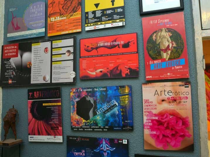 Muestra de arte erótico. En la sala donde da clases particulares exhibe los afiches que reúnen diez años de historia de "la Erótika".
