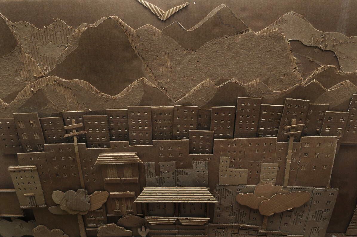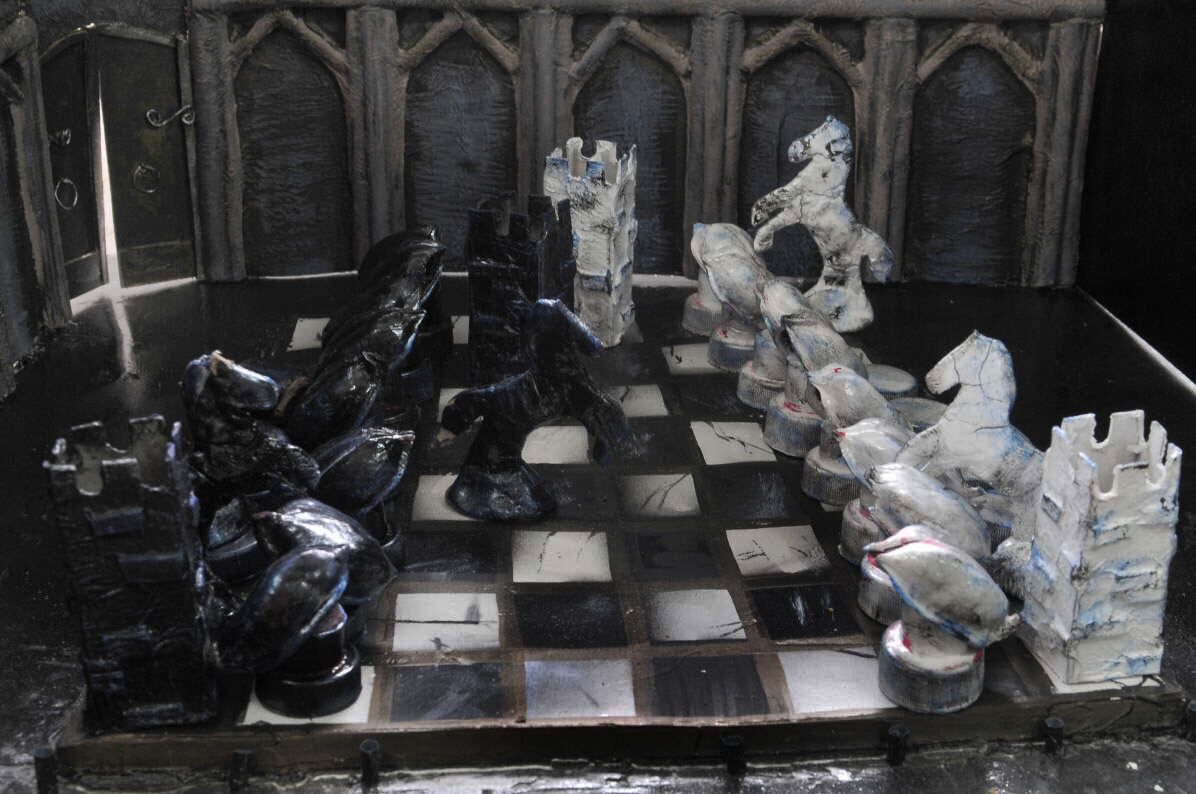 Mini-puestas. "Siempre se parte de un disparador. Aquí, por ejemplo, trabajamos con el Teatro a la Italiana, como el Independencia". El paso siguiente es realizar maquetas (como ésta, hecha por una alumna del taller) para ver en tres dimensiones la propuesta escenográfica. Ésta es una escena de "Harry Potter" con tapitas y cáscaras pintadas. Es interesante para observar la falsa perspectiva".