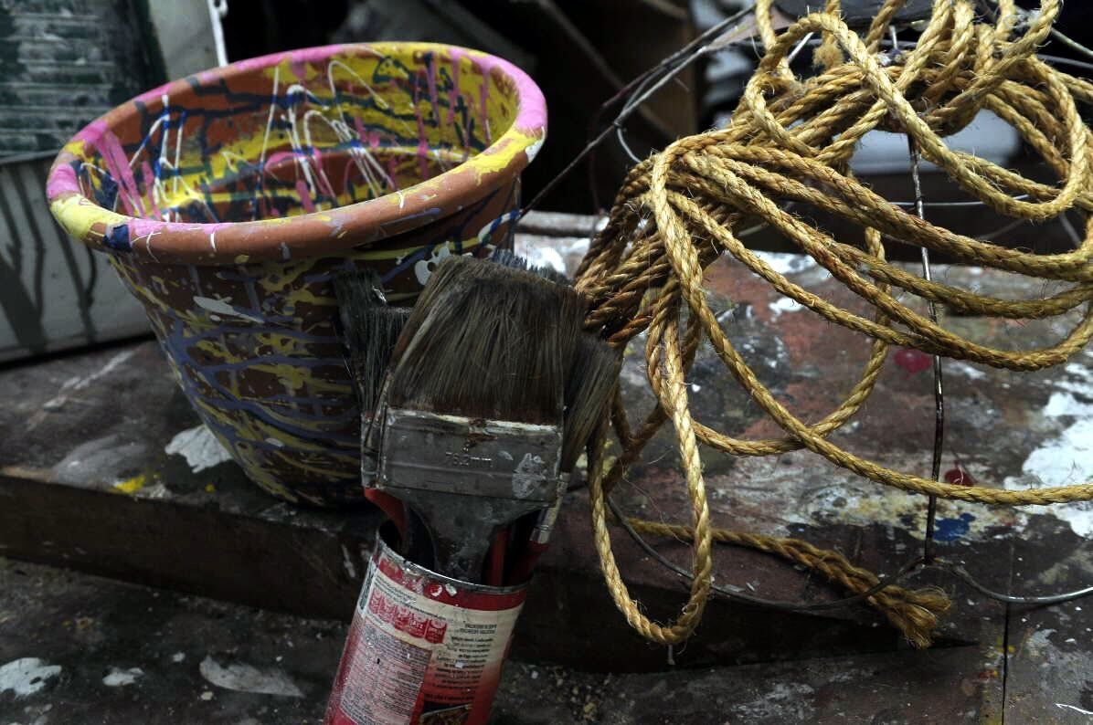 A construir. Pinceles, tachos de pintura y sogas son el ABC para convertir materiales encontrados en objetos significativos para la ficción.