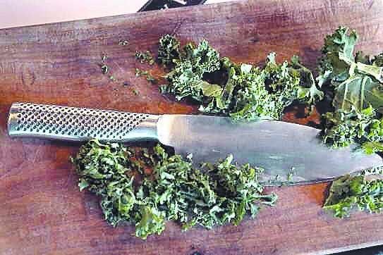 El filo del sabor. Un cuchillo de acero es una pieza fundamental en la tarea diaria. Se lo regaló su esposo y lo usa para cortar y deshuesar la carne. Para la foto, cortó kale, un vegetal nuevo en el cultivo de Mendoza, que viene del repollo y del brócoli.