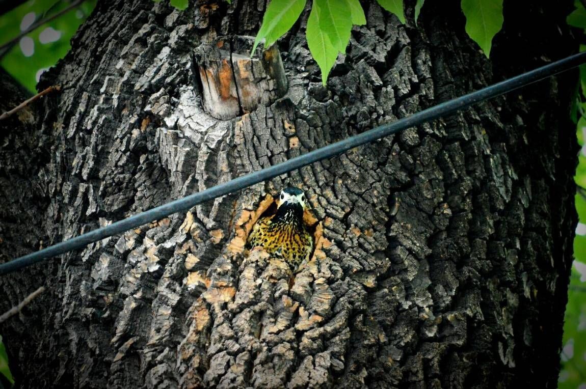 Un pájaro carpintero eligió como hogar el tronco de un árbol que está a metros de la Plaza Independencia, sobre calle Espejo.