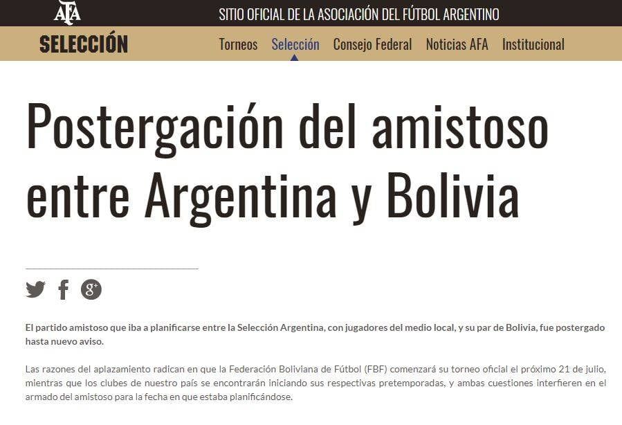 El partido amistoso que iba a planificarse entre la Selección Argentina, con jugadores del medio local, y su par de Bolivia, fue postergado hasta nuevo aviso.