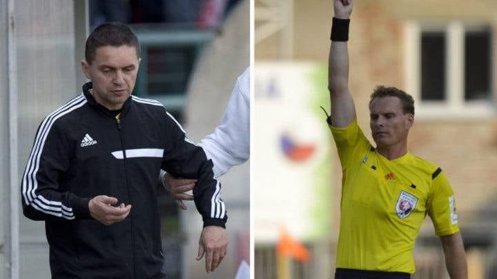 Dos árbitros en la liga checa de fútbol fueron inhabilitados indefinidamente después que uno parecía estar borracho en la banda y otro fue visto orinando durante el partido.