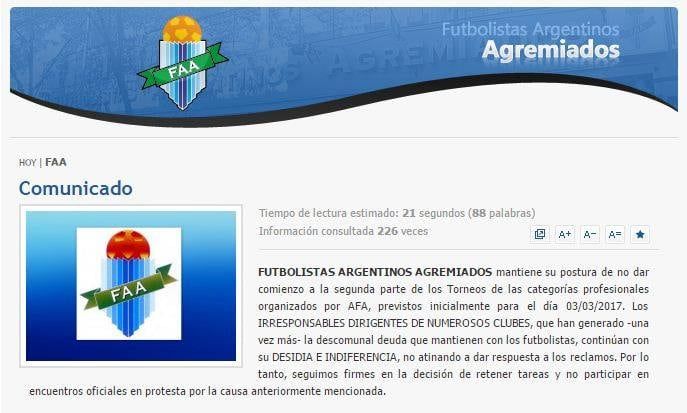 "FUTBOLISTAS ARGENTINOS AGREMIADOS mantiene su postura de no dar comienzo a la segunda parte de los Torneos de las categorías profesionales organizados por AFA, previstos inicialmente para el día 03/03/2017", informó el gremio.