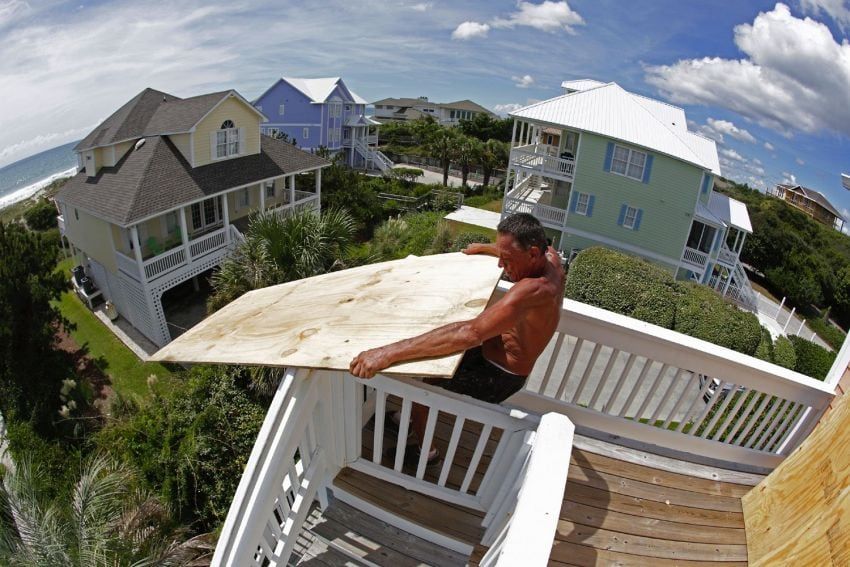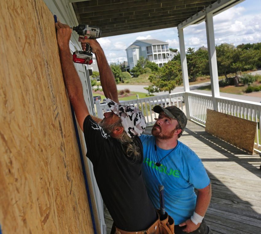 Joe Gore, izquierda, y Joshua Adcock tapan las ventanas de una casa en Emerald Isle N.C. Foto: AP