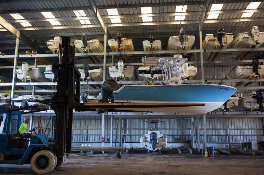 Un operador en el puerto deportivo de Casper trabaja para mover barcos a un terreno más alto en Swansboro, Carolina del Norte. Foto: AFP