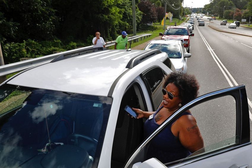 Yugonda Sample espera fuera de su automóvil mientras la gente intenta recoger sacos de arena. Foto: AP