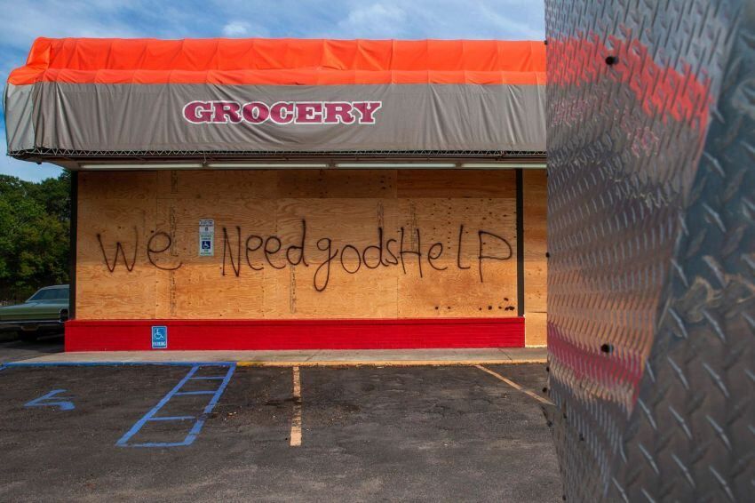 "Necesitamos la ayuda de Dios" está pintado en aerosol sobre tablas de madera que cubren las ventanas de una tienda de comestibles en Myrtle Beach, Carolina del Sur. Foto: AFP