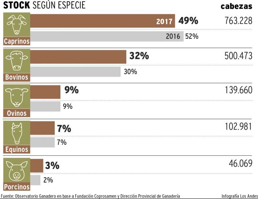 El año pasado el stock de animales existente en la provincia era de 1.502.866 cabezas, de las cuales un 49% con 763.228 fueron de animales caprinos. En su gran mayoría, las cabras provienen de Malargüe, 72% con 633.973 cabezas y Lavalle con 141.888 animales.