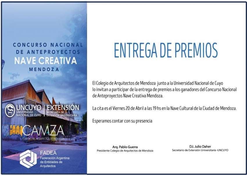 Ante la presencia de autoridades de la Universidad Nacional de Cuyo, del Colegio de Arquitectos de Mendoza y el asesor por parte del Colegio y escribana pública, se realizó la apertura de sobres para conocer a los ganadores del Concurso Nacional Nave Creativa seleccionados de acuerdo a la elección del Jurado, el cual estuvo compuesto por: Arq. Jimena Andia – Jurado por el CAMZA; Arq. Gerardo Montaruli – Jurado por los Participantes; Arq. Adrián Sebastian – Jurado por la F.A.D.E.A; D. I. Julio Daher – Jurado por el Promotor; Arq. Mónica Elmelaj – Jurado por el Promotor.