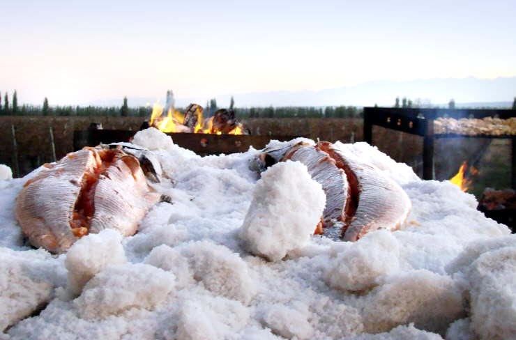 Cocinar en horno fuerte (200 grados) durante aproximadamente 45 minutos. Una vez cocido, se retiran los bloques de sal. Con un cuchillo de serrucho marcar el contorno del salmón, cortar al medio y retirar la piel. Con una cuchara y con la ayuda de las manos despegar la carne del hueso.