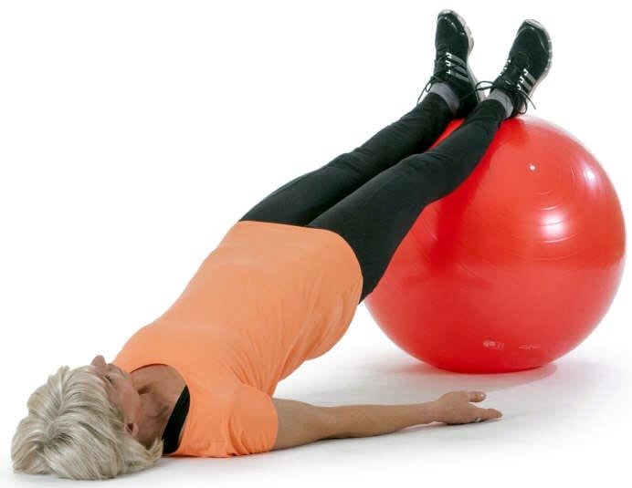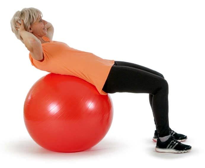 Un clásico para el abdomen. En este caso, coloque la espalda sobre la pelota. Las piernas permanecen dobladas sobre el suelo. Luego eleve la parte superior del cuerpo y sosténgala allí unos momentos.