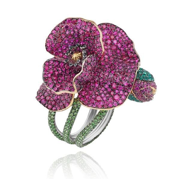 La sortija Amapola, creación de Chopard para su colección Red Carpet 2013. Una minuciosa obra de arte en oro amarillo y blanco en la que han mezclado con los diamantes más de 700 rubíes, 640 tsavoritas y 168 esmeraldas.