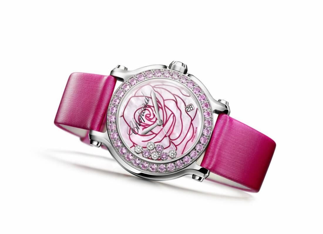 El maravilloso reloj La vie en rose de Chopard en oro rosa con zafiros rosas, esfera de madreperla rosa con dibujo de una rosa, malla de satén rosa y sus características piezas móviles: 4 diamantes y 3 zafiros rosas.