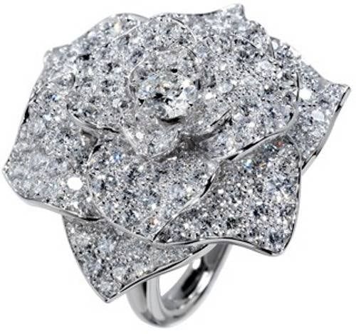 La sortija Rosa de Piaget que está inspirada en la rosa Yves Piaget, con pétalos completamente engastados con 112 diamantes talla brillante creando la apariencia de una auténtica flor.