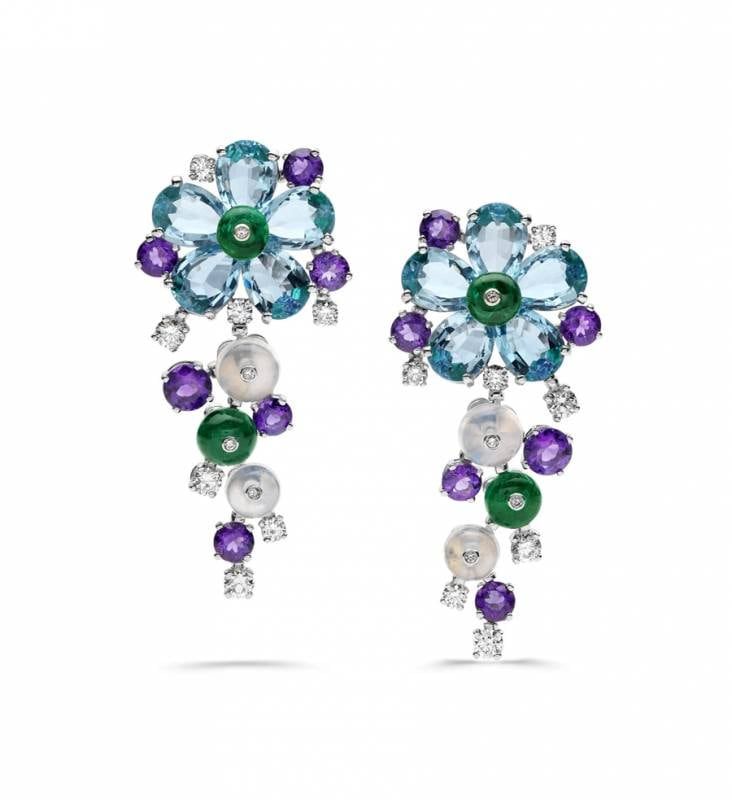 Los aros pendientes de Bulgari de la colección Alta Joyería, realizados en oro blanco, con pétalos de aguamarinas salpicados de diamantes talla brillante, esmeraldas, amatistas y adularias.