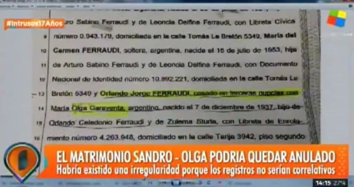 Olga Garaventa habló con Jorge Rial y mandó la libreta de casamiento donde ella y Sandro aparecen como "solteros" y aclaró que la jueza sabía de los matrimonios en el exterior pero que los casó igual. El caso irá a la Justicia.
