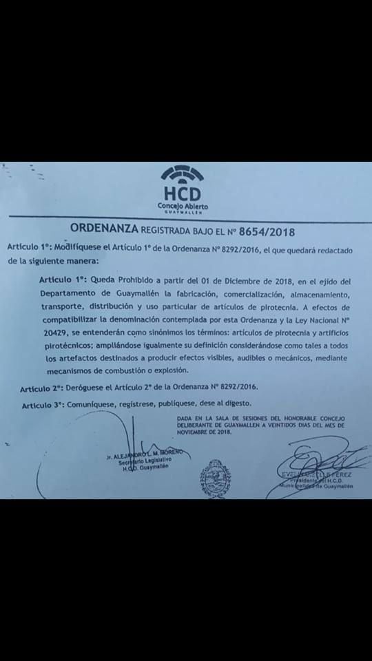Por medio de la ordenanza 8.654/18, los ediles guaymallinos modificaron otra norma (8.292/16) y en su artículo 1 se establece que a partir del 1 de diciembre de 2018 no se permitirá en todo el departamento "la fabricación, comercialización, almacenamiento, transporte y uso particular de artículos de pirotecnia". Además, la renovada ordenanza contempla en la prohibición a todos los artefactos destinados a producir efectos visibles, audibles o mecánicos, "mediante mecanismos de combustión o explosión". Y deroga el artículo 2 de la ordenanza del 2016.
