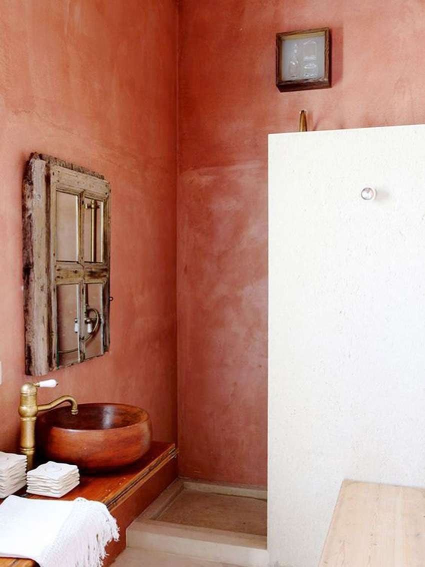 Los tonos tierra son una buena opción, este rosa anaranjado nos recuerda al color rojizo de la arcilla. En el baño, como vemos en la imagen, queda estupendo.