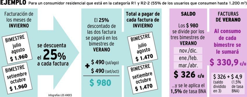Es decir, que las facturas de invierno, del período 4 y 5 quedarán en $1.470. Mientras que los $980 de esos dos períodos se abonarán en los meses que van desde noviembre de 2018 a abril de 2019, en tres cuotas de $326 para los clientes bimestrales y seis para los clientes mensuales.