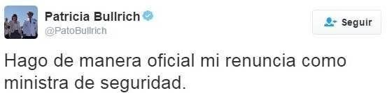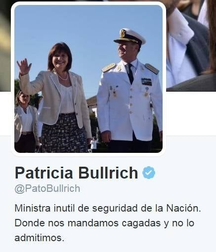 La cuenta de Twitter de Bullrich, con más de 326.000 seguidores, comenzó poco antes de las 16 a tuitear una serie de mensajes con insultos hacia la ministra de Seguridad y el presidente Mauricio Macri.