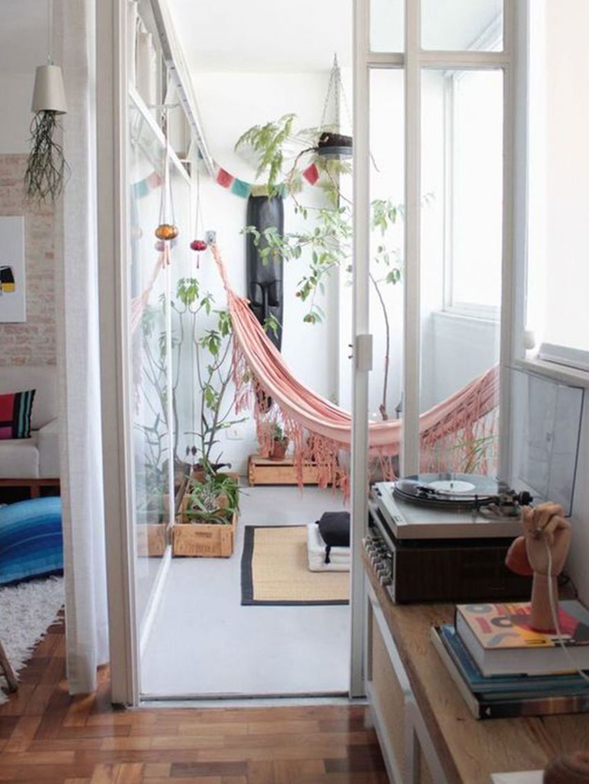 Otro gran lugar es el dormitorio. En general, los dormitorios no necesitan de una gran cantidad de muebles, por lo que hay un montón de espacio libre para colgar una hamaca a lo largo de una pared. Algunos hoteles también han adoptado esta idea.