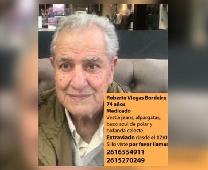 Viegas Bordeira (74) era dueño del hotel El Nevado (Guaymallén) y ex futbolista de Luján Sport Club, donde jugó en los años 60 y 70. Viegas desapareció el martes pasado, cuando salió de su casa de barrio Palmares a bordo de su Citroën C3. Preocupada, su familia denunció la ausencia horas más tarde, ya que el anciano padecía algunos problemas de salud y "solía perderse en tiempo y espacio", tal como confió a este diario la hija del hombre.