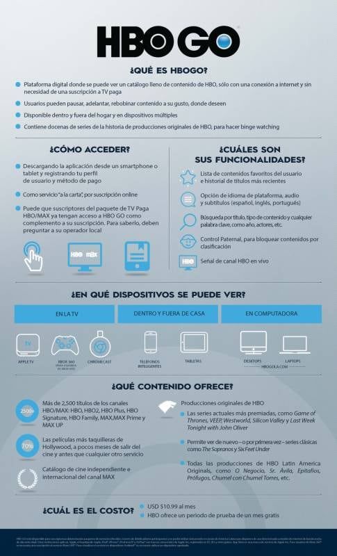 ¿Qué contenido ofrece HBO GO? Cuenta con más de 2.500 títulos exclusivos sin cortes comerciales, incluyendo series originales, documentales y especiales de HBO, así como también el 70% de los éxitos más recientes y taquilleros de Hollywood y en HD. También ofrece una selección exclusiva del mejor cine internacional e independiente.