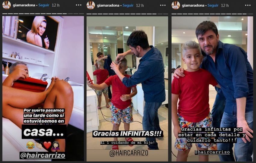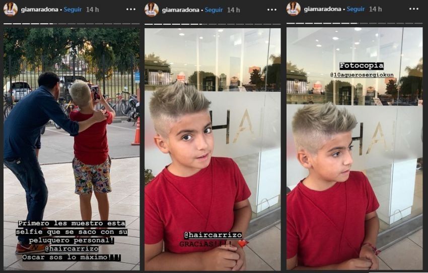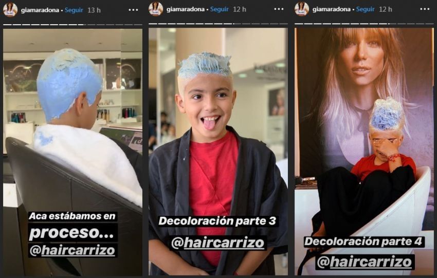 Quien mostró el nuevo look del pequeño de 9 años fue su mamá, Gianinna Maradona; ella compartió en las historias de Instagram el paso a paso de la decoloración y posterior coloración del menor.