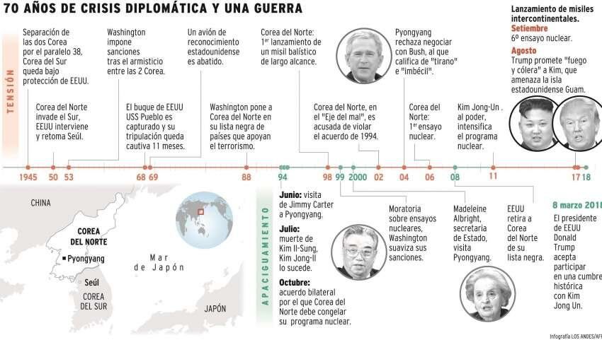 No fueron revelados, sin embargo, el lugar o la fecha exacta del encuentro, aunque se espera para fines de mayo. Semejante reunión era hasta hace pocas semanas impensable ante la espiral de tensión entre Washington y Pyongyang por los programas balístico y nuclear de Corea del Norte.