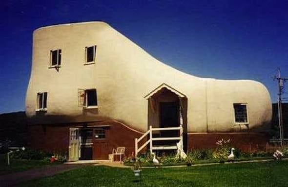 Esta casa fue construida en 1948, de cuando data la foto, por Mahlon Haines un vendedor de zapatos que quiso hacer de su vivienda un anuncio de publicidad gigante, de más de 7 metros de altura. Haines vivió aquí poco tiempo y ahora, aún en pie y en perfecto estado de conservación, se puede visitar. Hoy en día es un museo.