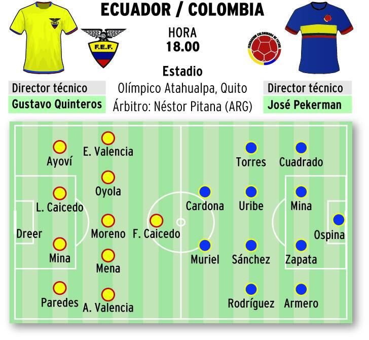 Colombia visita a Ecuador en un duelo que puede dejar a uno de los dos afuera de los cinco primeros lugares. Hace 20 años que Colombia no le gana a Ecuador en e Atahualpa de Quito.