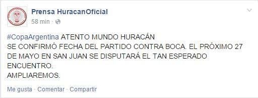 Huracán Las Heras y Boca Juniors jugarán el próximo miércoles 27 de mayo a las 21.30 por los 32avos. de final de la Copa Argentina, segín lo confirmó el presidente de la institución lasherina, Rafael Giardini.