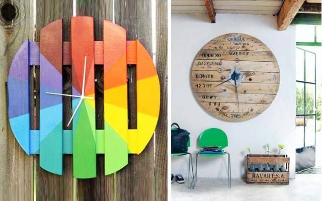Otra idea es hacer relojes con palets, en su tono natural de la madera o pintada de colores como estos.