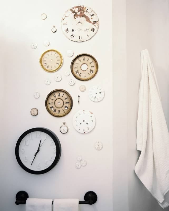 Composición de distintos tamaños y maquinarias de viejos relojes dan vida a esta pared del baño.
