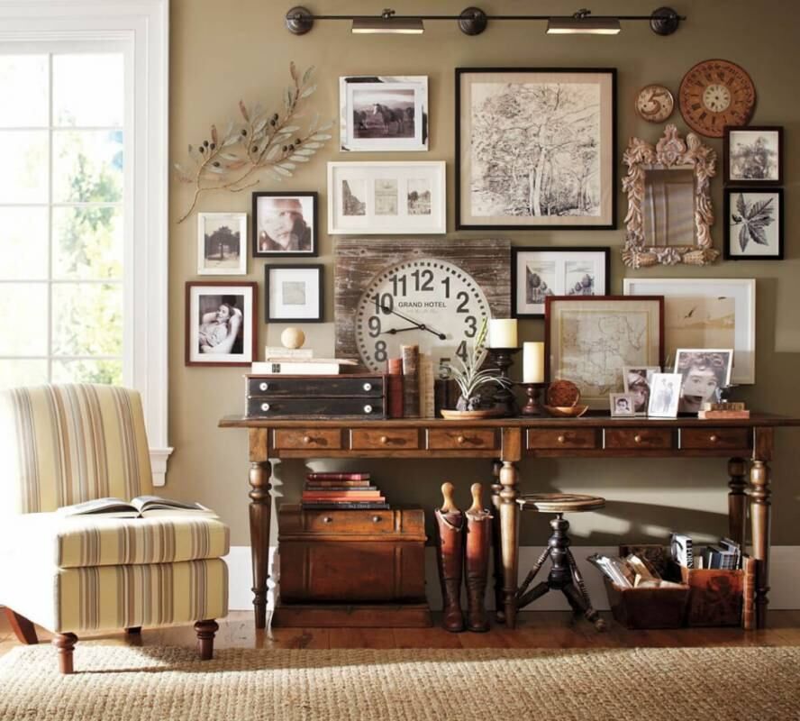 Relojes grandes integrados dentro de una composición de cuadros y espejos, decoración clásica y señorial.