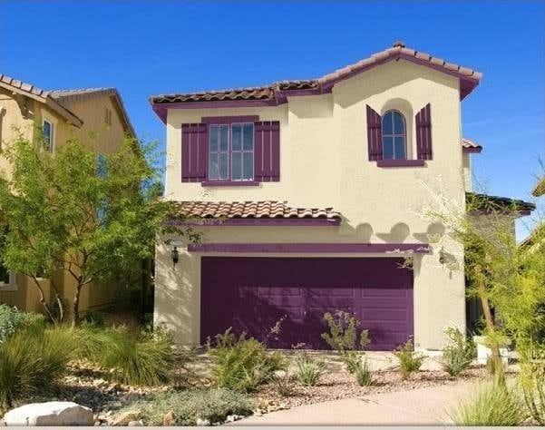 FACHADA DE CASA PINTADA DE BLANCO EN CONTRASTE CON MORADO