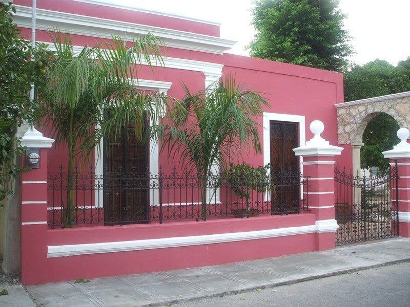 FACHADA DE CASA PINTADA DE ROSA Y MOLDURAS EN BLANCO