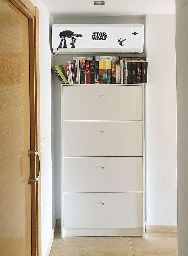 Dependiendo de dónde se encuentre ubicado el split del aire acondicionado, podemos hacer un mueble a medida para ocultarlo, pero quizá añadiendo además algo más de valor que, además de ocultar el aire, actúa como de un pequeño zapatero