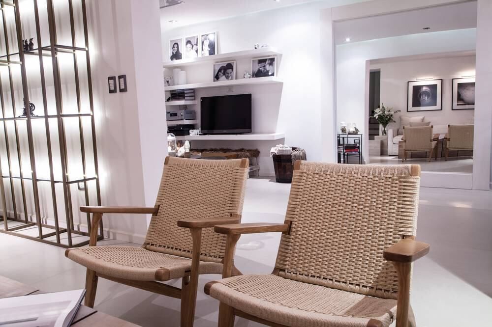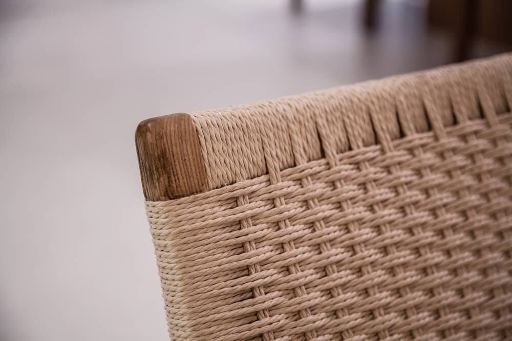 Las poltronas de estructura de madera y tejidas aportan textura desde su material. En detalle, la trama del tejido. Son piezas que aportan suma elegancia al estar.