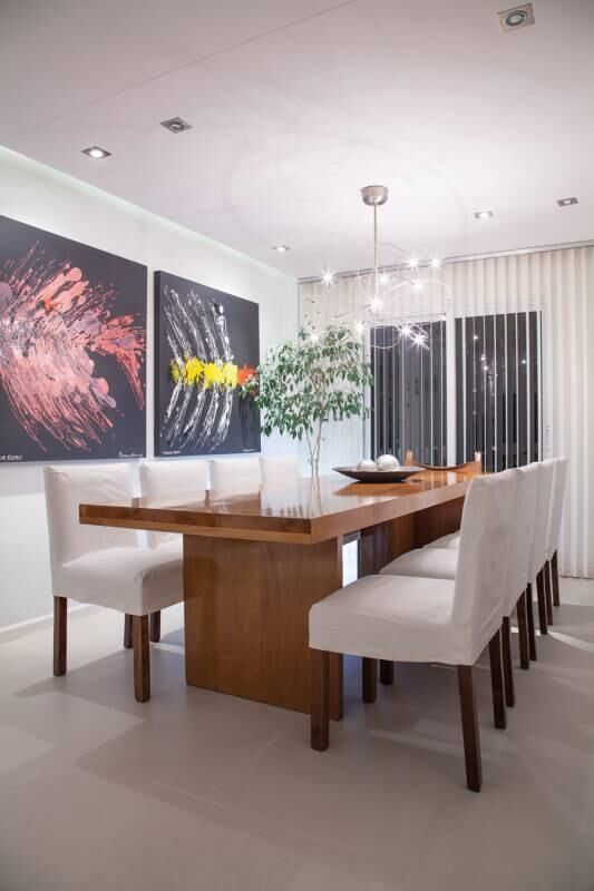 En el comedor principal dos imponentes cuadros son los que le dan carácter al sector. Una gran mesa lustrada con sillas blancas acompañan al resto del entorno sin quitarle protagonismo. Sobre todo, porque en los muros opuestos sus grandes ventanales hacen que ingrese la luz y el verde del jardín.