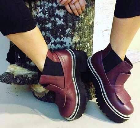 Botitas cortas de cuero, de gran plataforma, con detalles de solapas frontales y combinado de tonos laterales. Foto gentileza: Alonso.