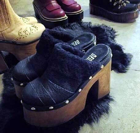 Derecha: bucaneras negras con plataforma de madera. Izquierda: borcegos cortos con detalle de herraje lateral. Foto gentileza: Guadalupe Zapatos