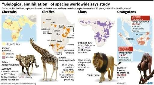 Las poblaciones de leones, rinocerontes y guepardos cayó en más del 90% durante el siglo pasado. El número de jirafas, clasificadas como "vulnerables", disminuyó en un 40% en 30 años. Y el 30% de los osos polares podrían desaparecer de aquí a mediados del siglo XXI.