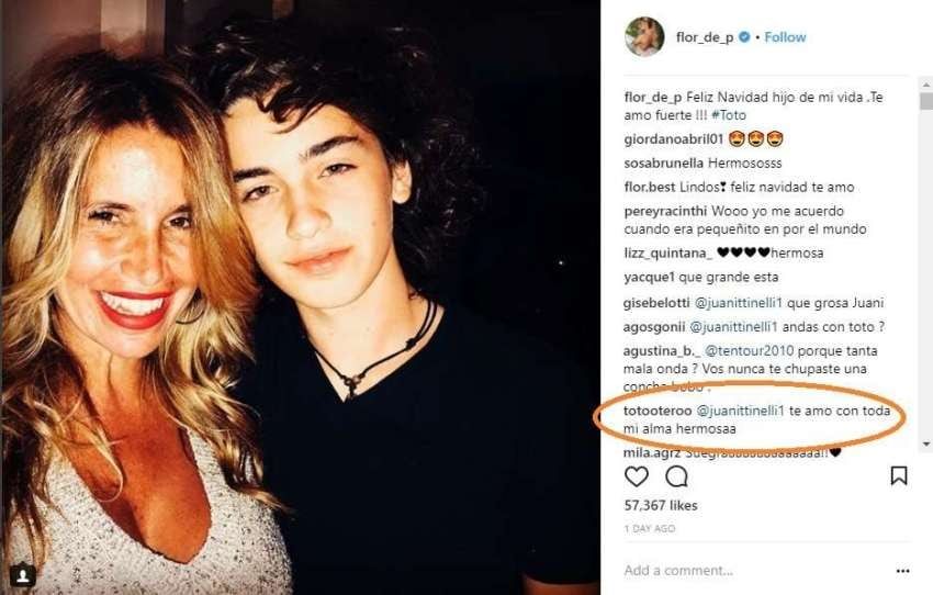 La supuesta parejita se dedicó comentarios muy cariñosos en Instagram, en una publicación realizada por Flor. Ella escribió (y luego borró): "Hermosa pareja hacemos". En la misma postal y ante las reiteradas preguntas de los usuarios de la red social, Toto le escribió Juanita: "Te amo con toda mi alma hermosa".