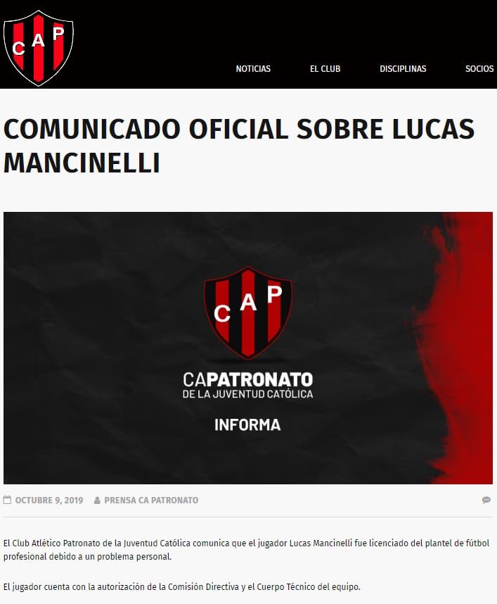 Por su parte, el club Patronato publicó un comunicado oficial en el que aseguró que Mancinelli "fue licenciado del plantel de fútbol profesional debido a un problema personal" y que cuenta "con la autorización" de la Comisión Directiva y el cuerpo técnico.