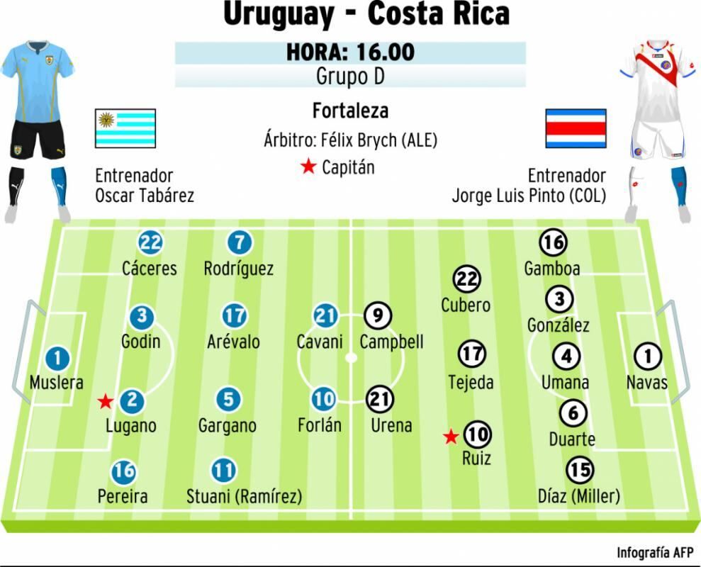 Uruguay, bicampeón mundial, tiene prácticamente el mismo equipo que causó sensación en Sudáfrica 2010 al llegar a las semifinales con actuaciones descollantes de Diego Forlán, elegido el mejor jugador de ese torneo, y Luis Suárez.